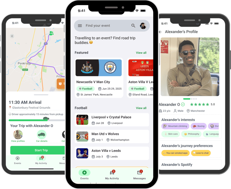 Carpool to games and gigs with verified fellow fans — up to 70% cheaper than trains.